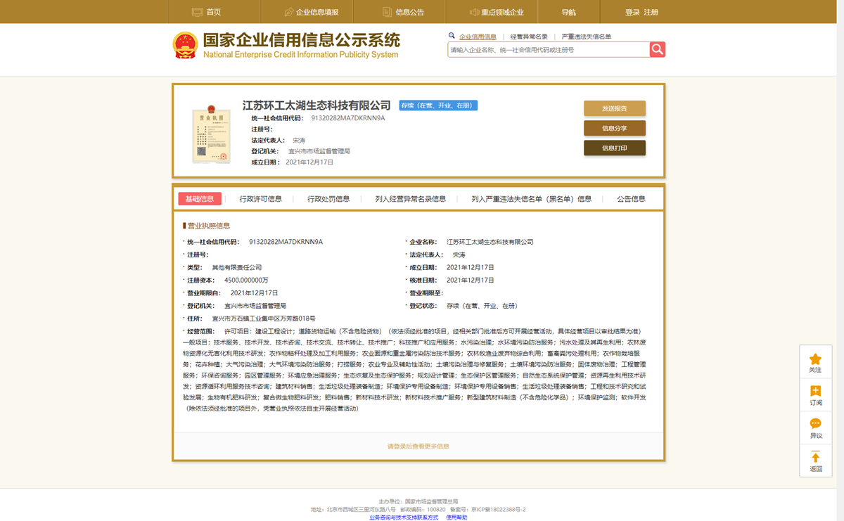 江蘇環工太湖生態科技有限公司信息公開事項