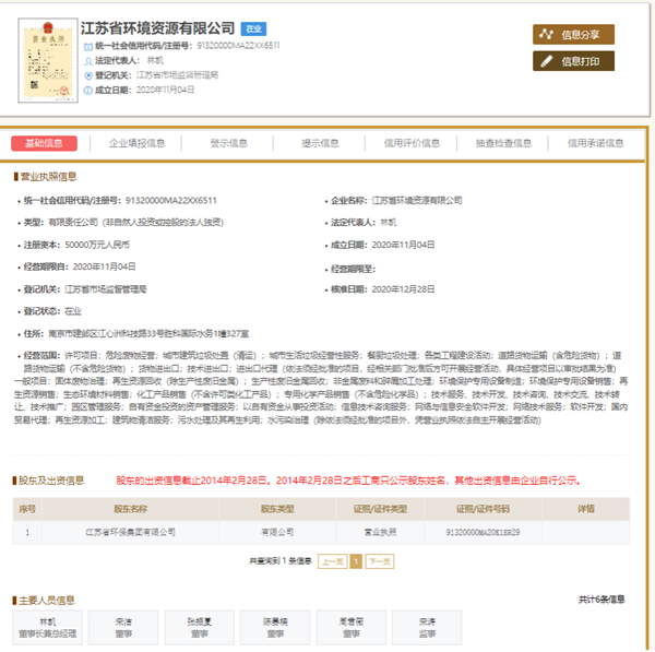 發(fā)布日期:2022-04-26 12:54 來源:江蘇省環(huán)境資源有限公司 字體:[ 大 中 小 ] 一、工商注冊登記等企業(yè)基本信息