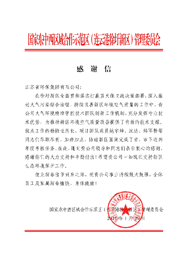 2020年,徐圩新區(qū)空氣質(zhì)量和改善幅度在全市均排名第二,成為了連云港市PM2.5平均濃度率先達(dá)到環(huán)境空氣質(zhì)量二級標(biāo)準(zhǔn)的區(qū)域之一,實(shí)現(xiàn)了歷史性突破,環(huán)境工程技術(shù)公司也獲得了徐圩新區(qū)管委會的高度贊揚(yáng)和肯定。